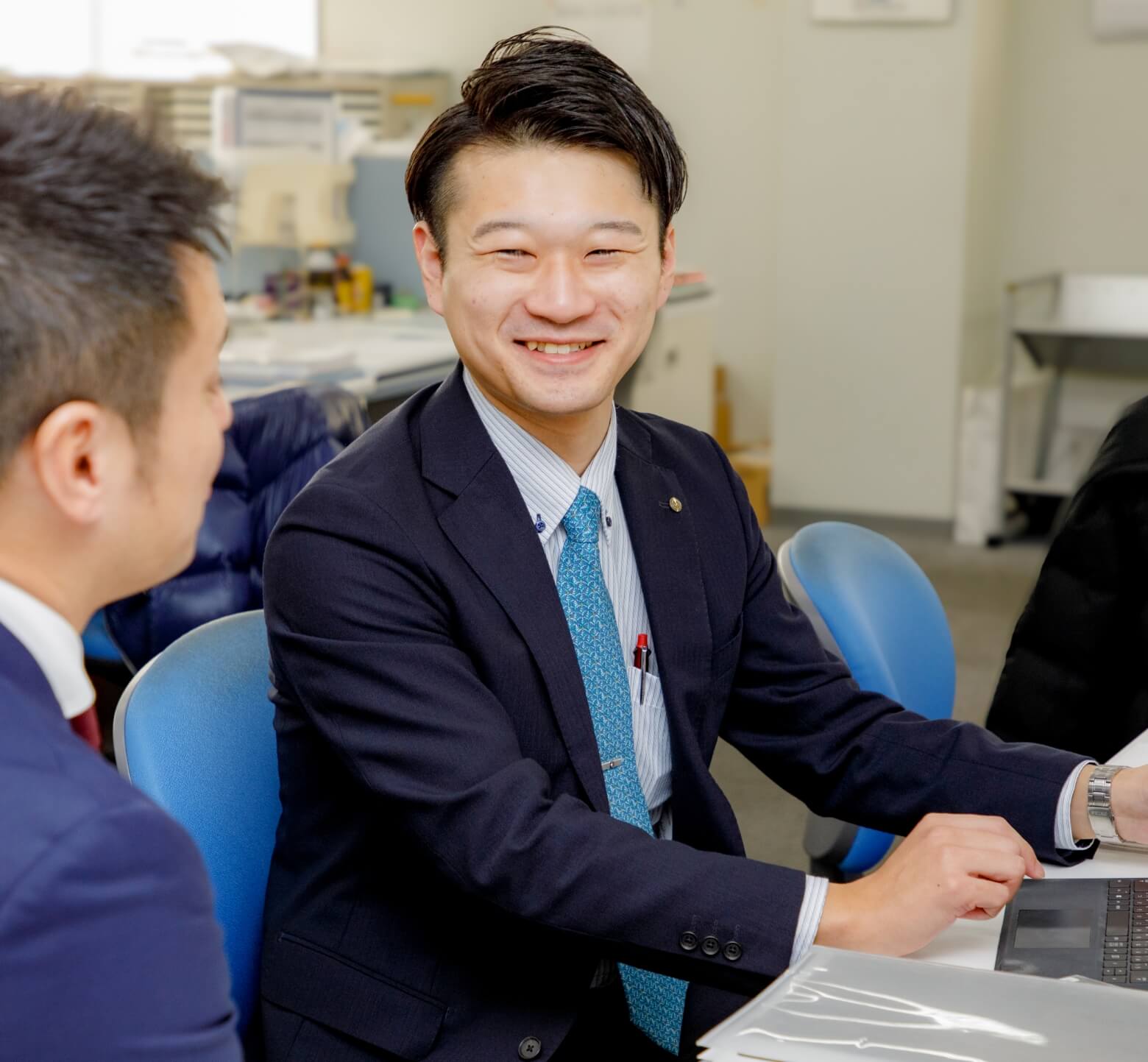 埼玉支社の営業2課は9名のチームで、他部署より平均年齢が若く、賑やかな雰囲気です。普段からコミュニケーションが活発で、上司への報告や相談がしやすい環境だと感じます。休日は会社の仲間とスノーボードに行くなど、プライベートも充実しています。後輩の指導では、自分が新人だった時の経験を活かし、現状の理解度を把握しながらサポートすることを心がけています。また、現場のニーズと病院上層部の意向が異なる場合もありますが、コスト計算資料を作成するなど、双方にとって最適な提案ができるよう努めています。